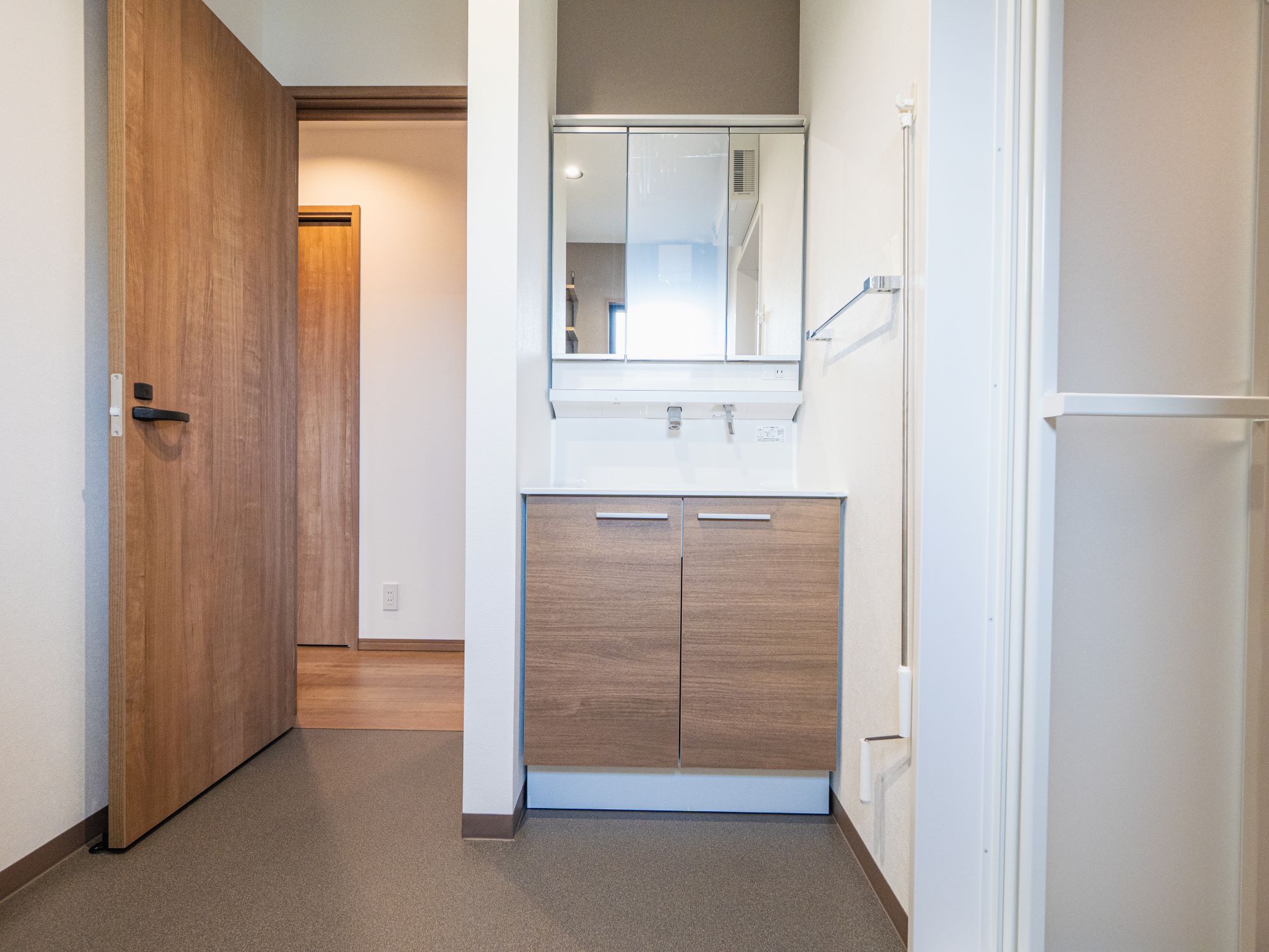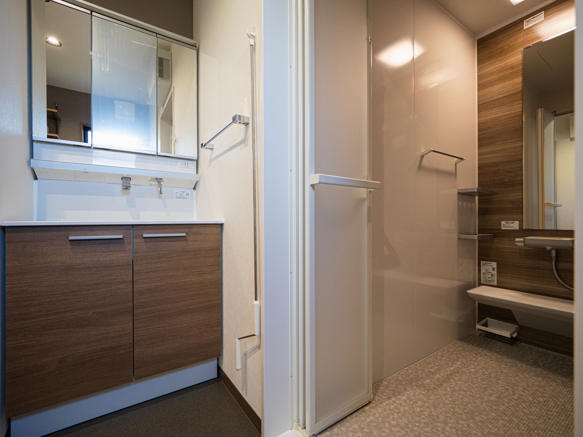 ガス衣類乾燥機の他に、室内物干しも。洗面脱衣室で洗濯が完結できる設備を揃えました。