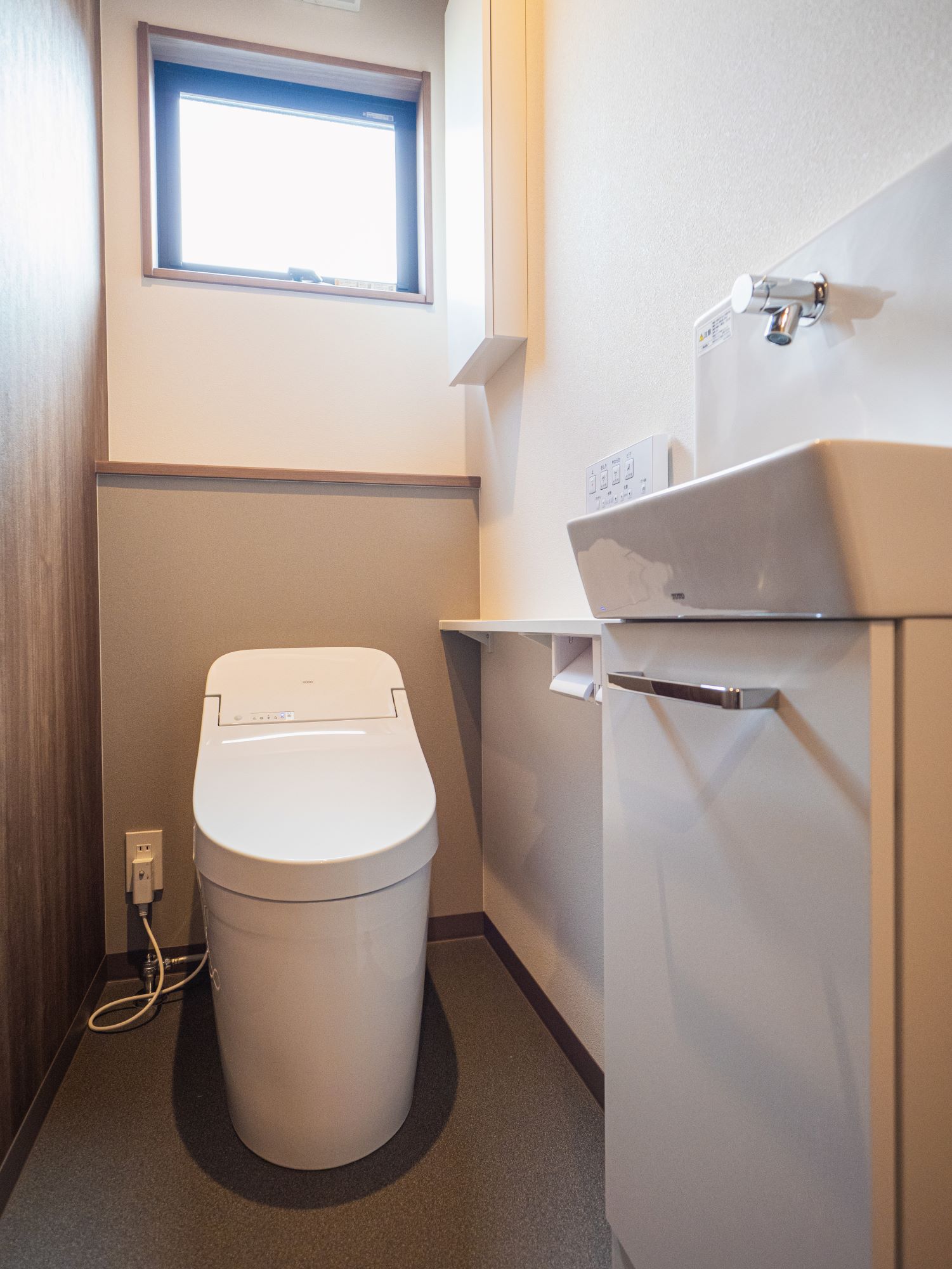 黒と茶の落ち着いた外観に、片流れ屋根と箱型を組み合わせた平屋の住まい。18畳のLDKや広めの洗面室など、ゆとりある空間と適量適所の収納で心地よく暮らせます。