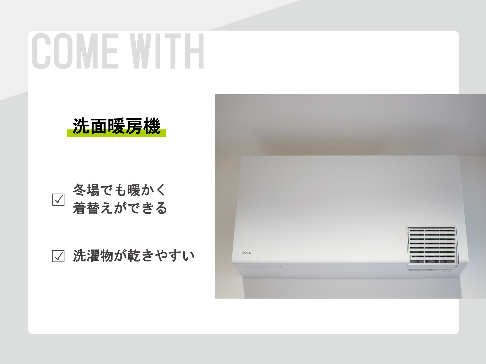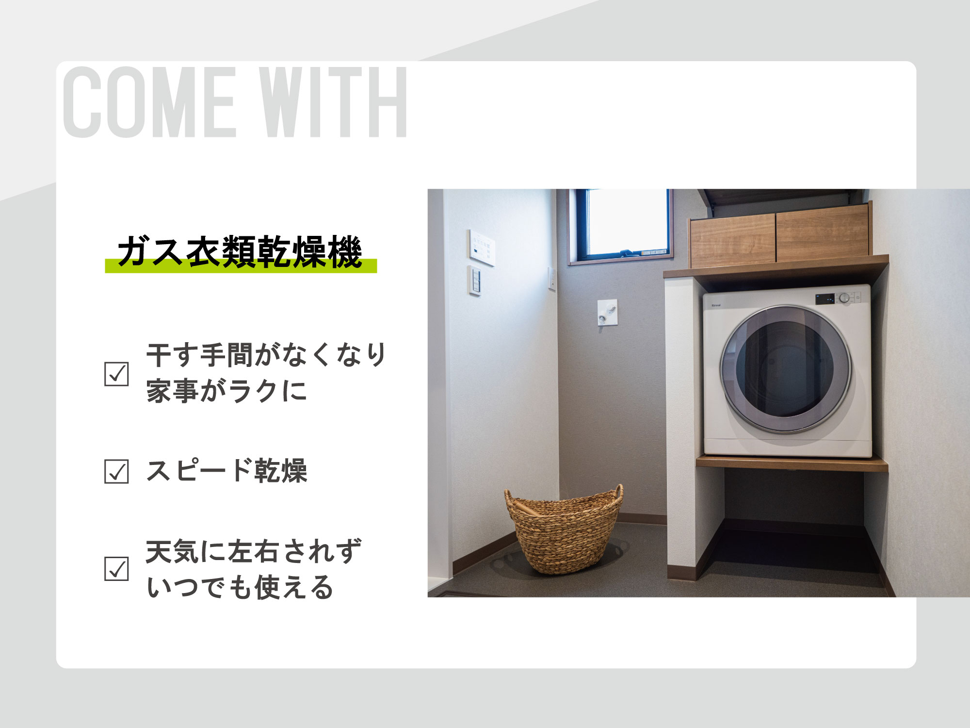 洗面脱衣室には、ガス衣類乾燥機あり。洗濯の時短はもちろん、洗濯物がふんわり心地いい仕上がりに。