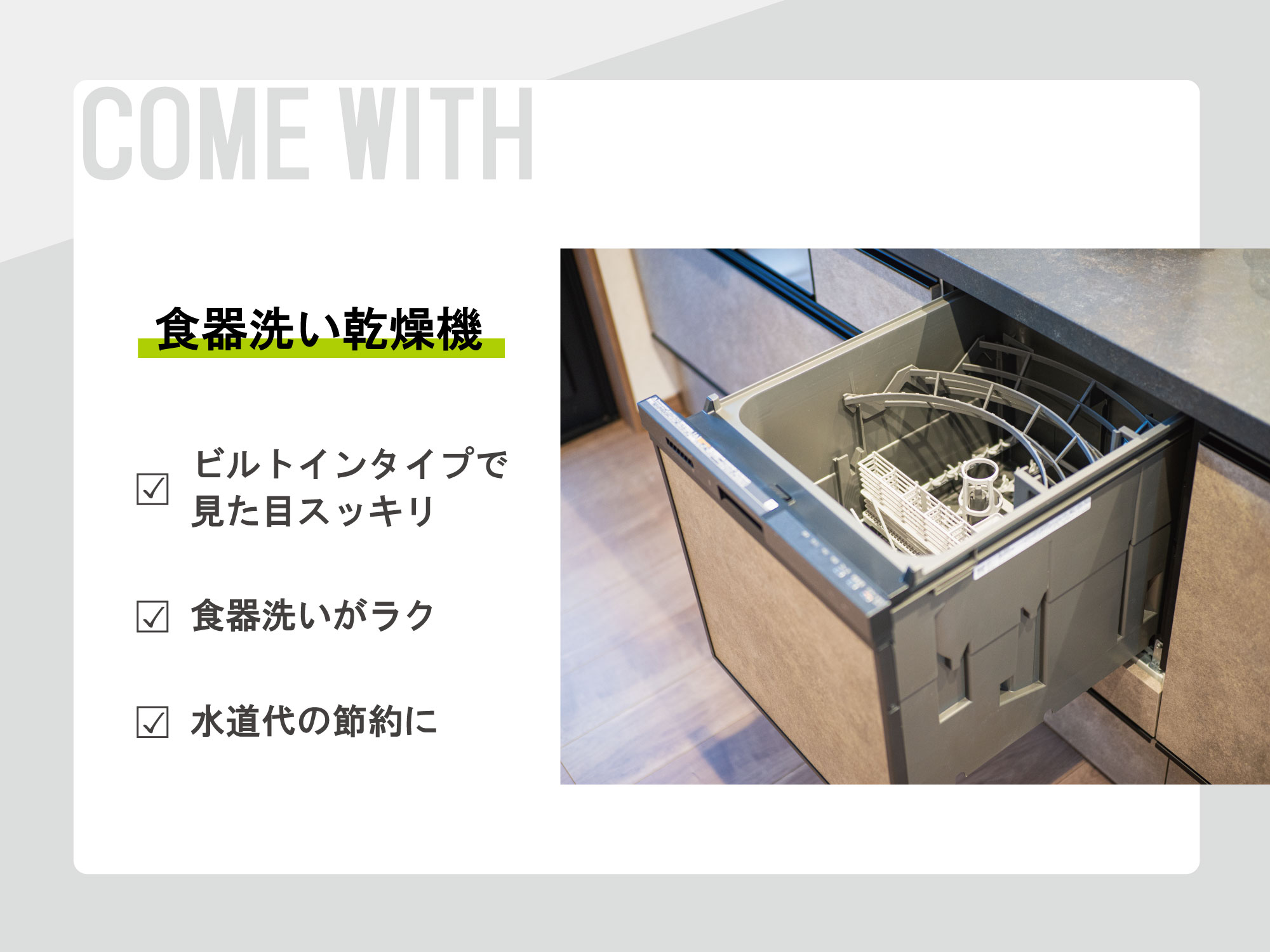 料理中もリビングが見渡せる対面式。家事をしながらお子様の様子が見守れ、大人も子どもも安心の住まい。