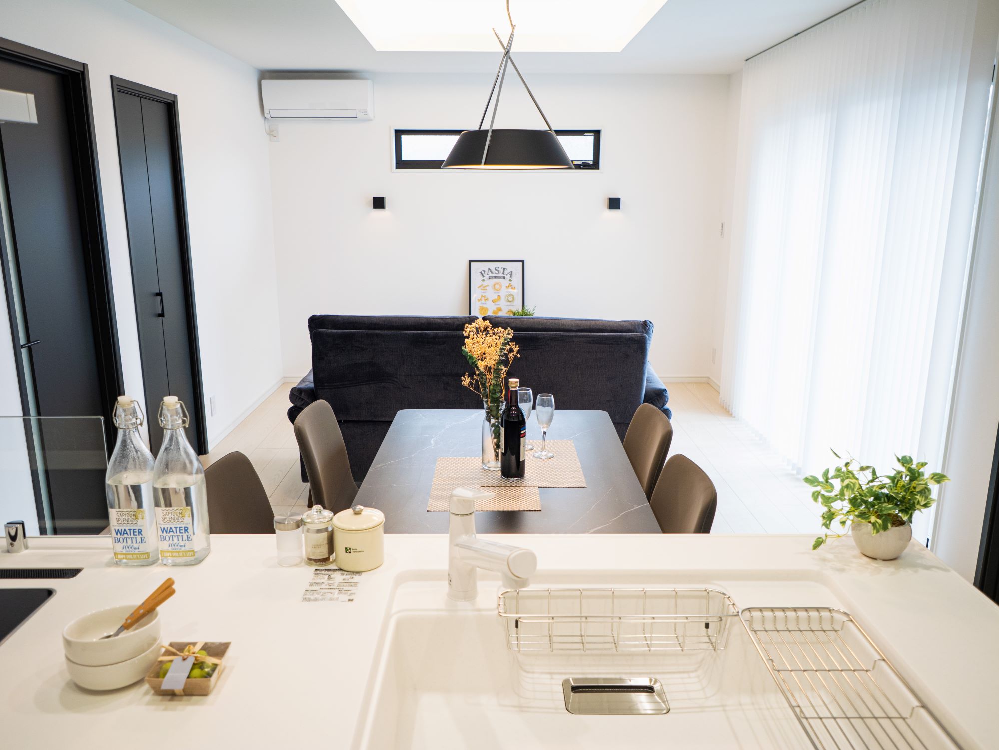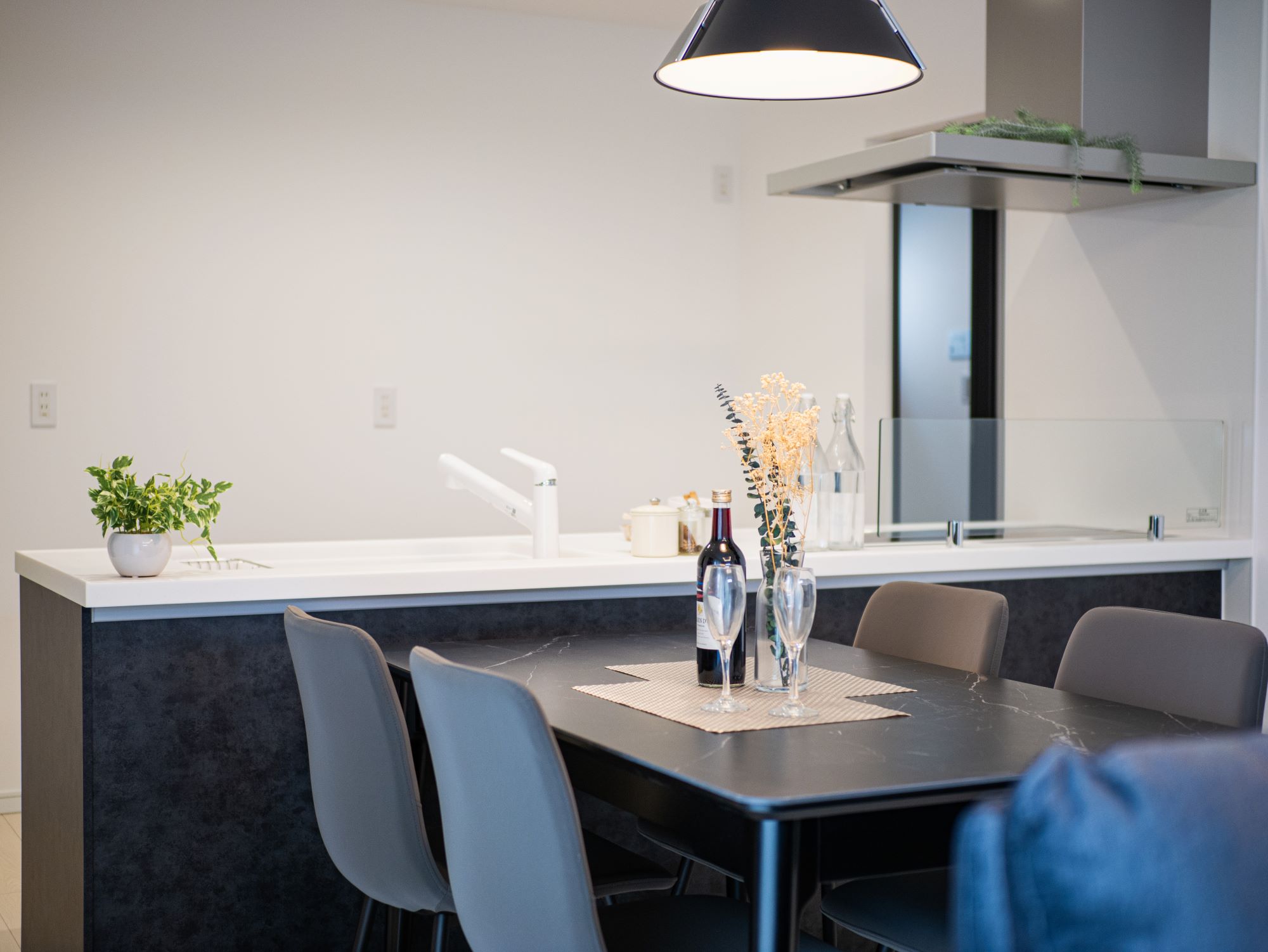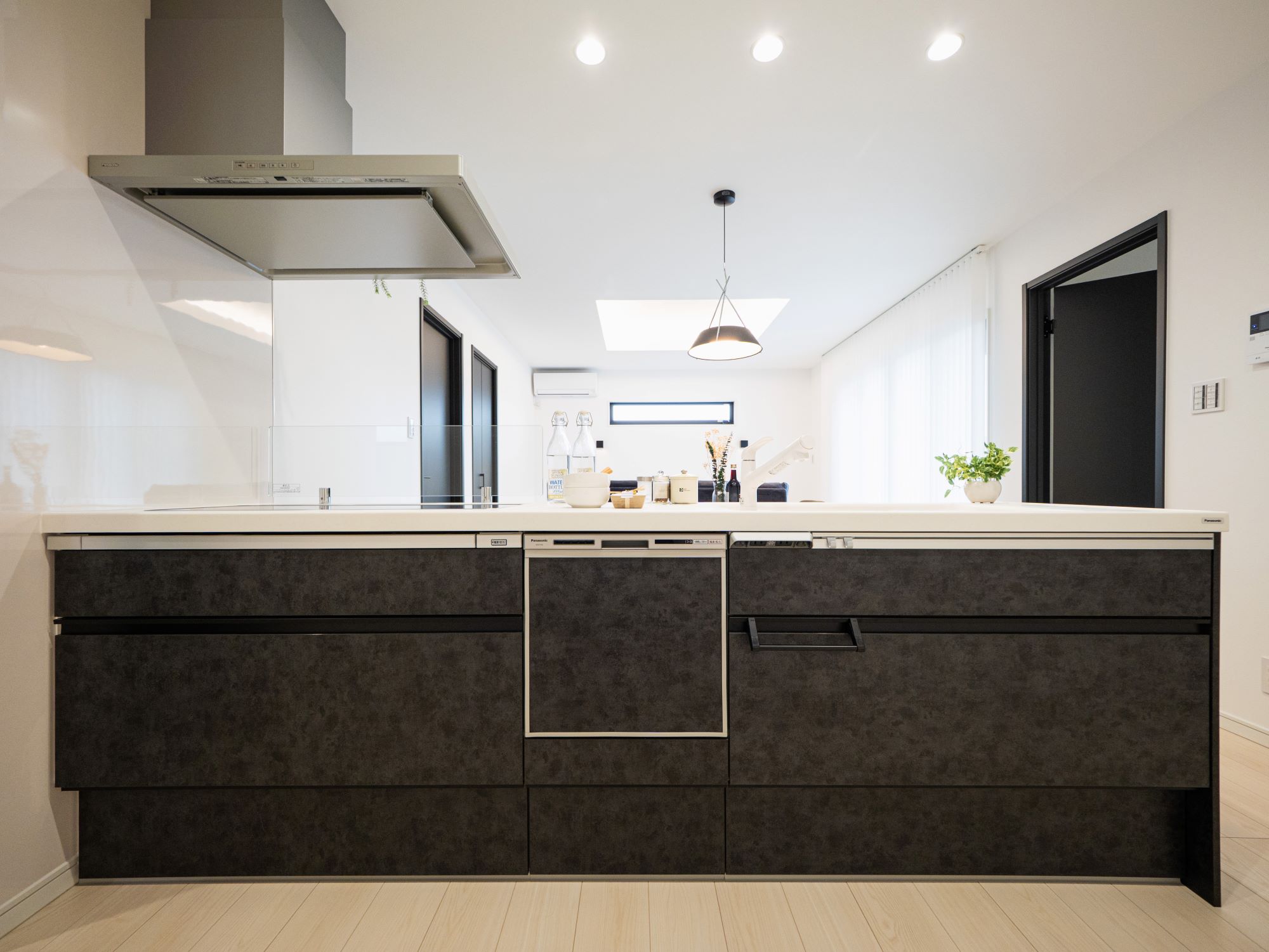 キッチンは開放感あふれるオープンタイプ。見た目の美しさはもちろん、3口のIHや食洗機などの便利な設備も。