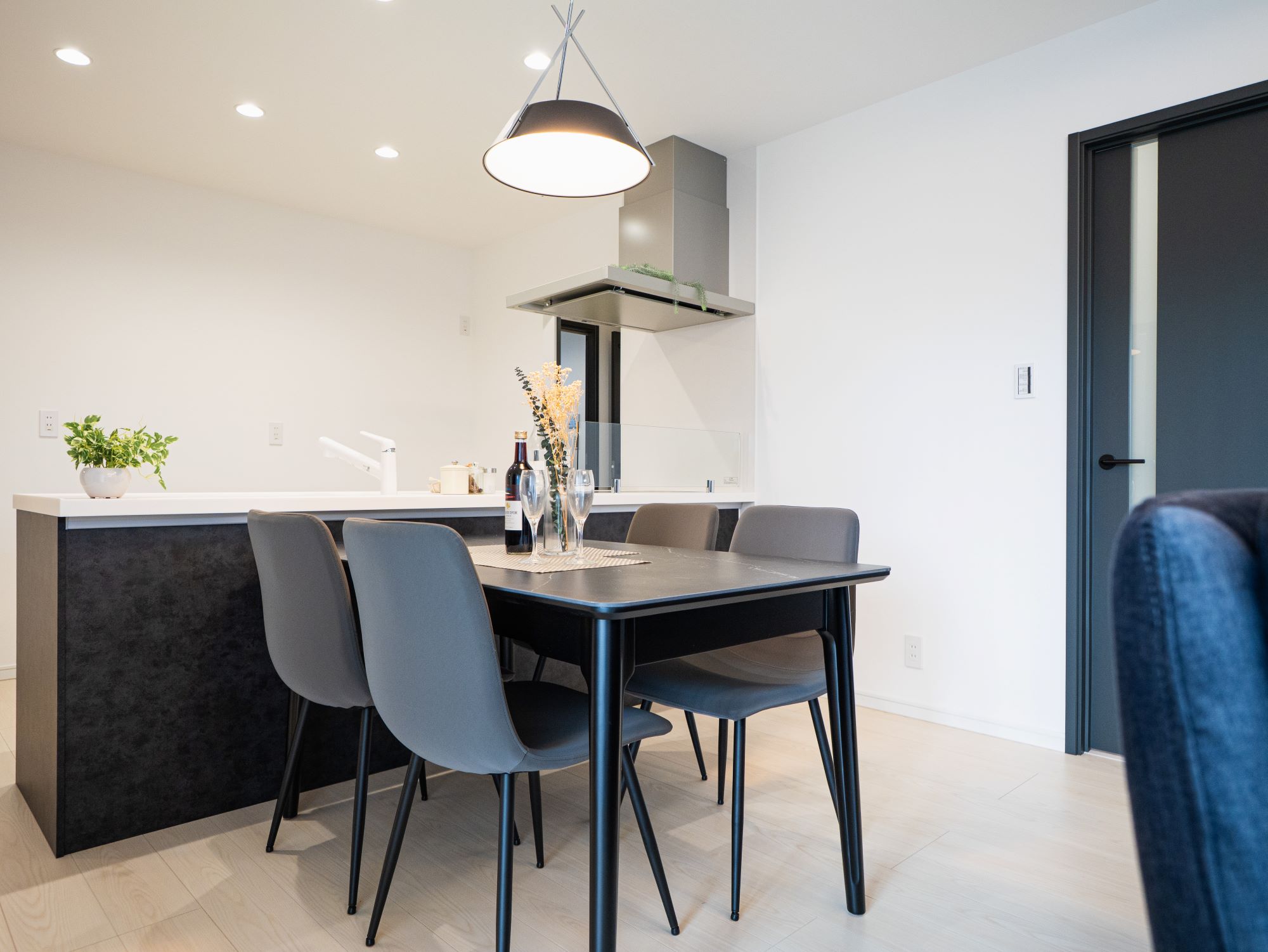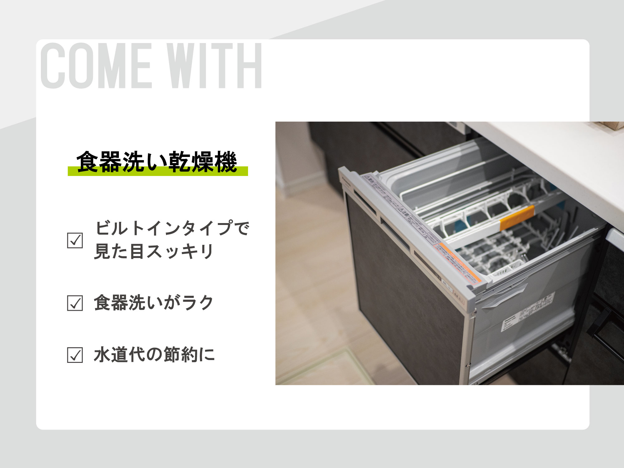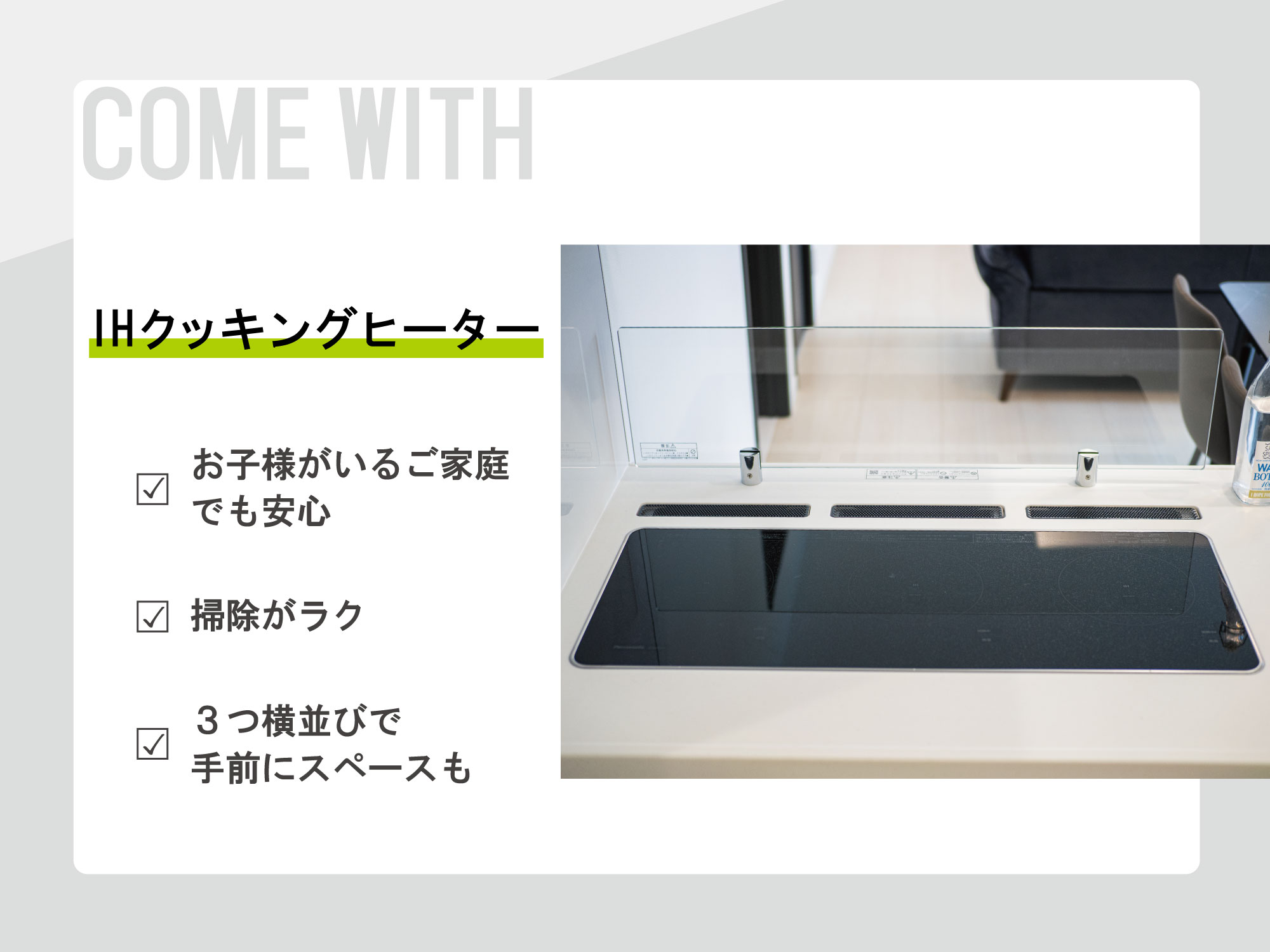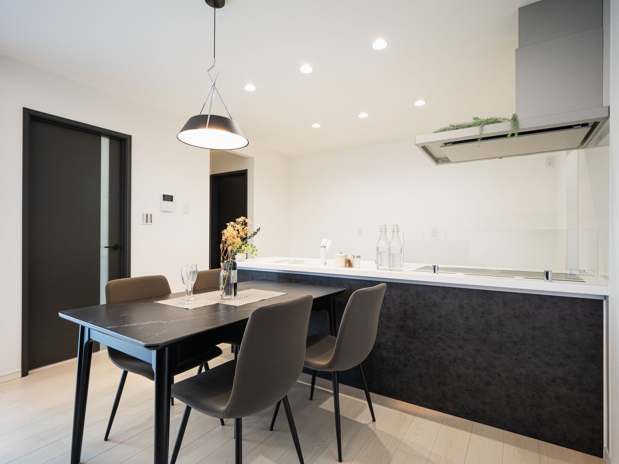 キッチンは開放感あふれるオープンタイプ。見た目の美しさはもちろん、3口のIHや食洗機などの便利な設備も。
