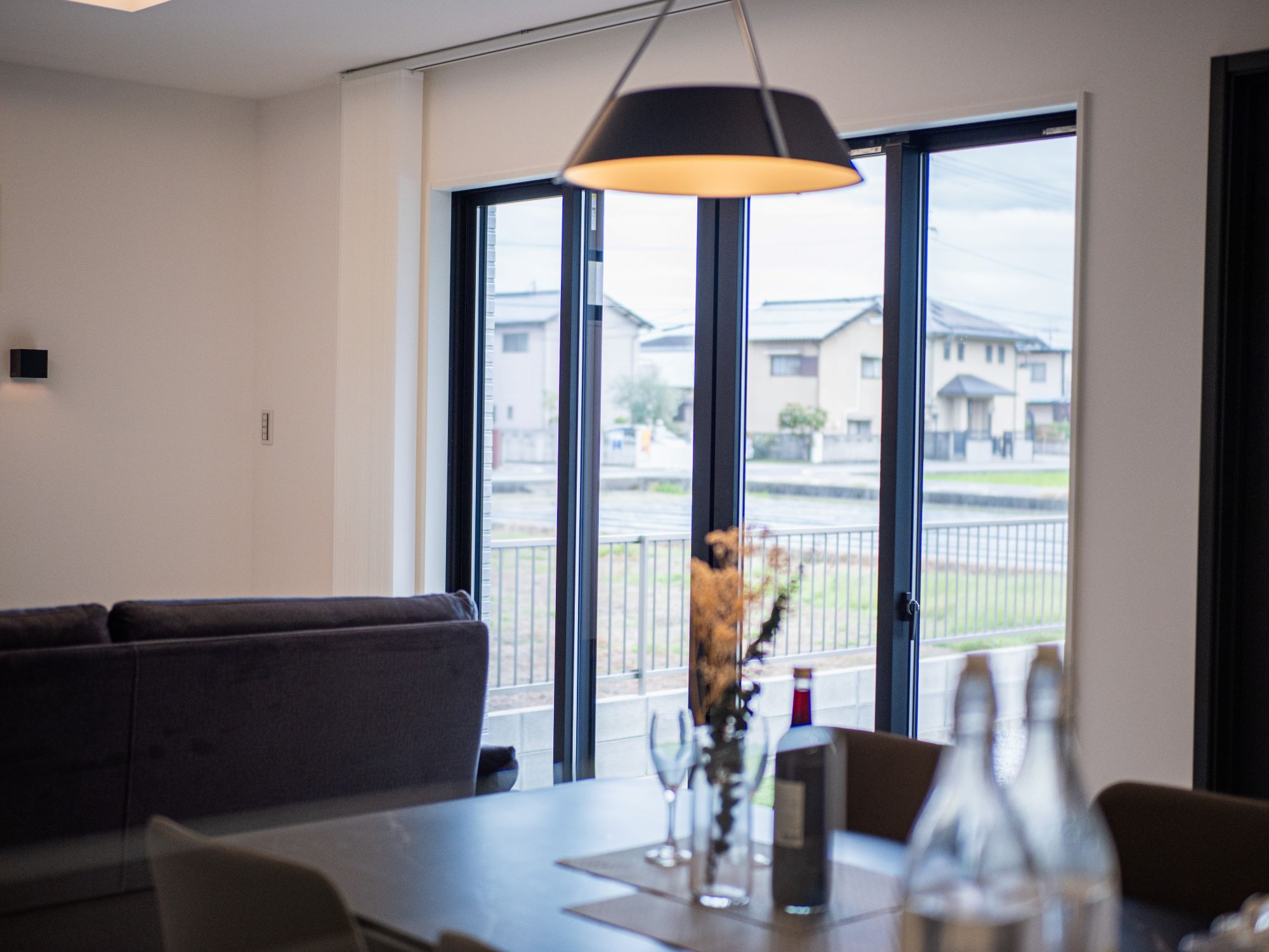 リビングからは庭が見渡せ、外の景色を日常に取り込むことができます。外とのつながりを自然と感じられる、くつろぎ空間。