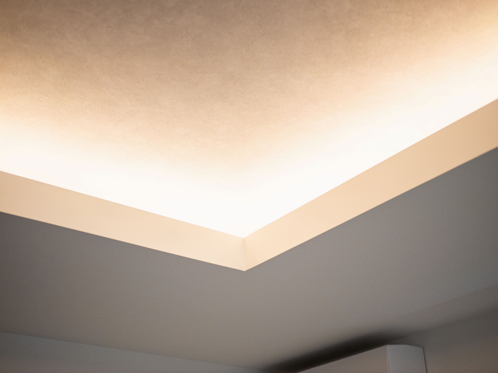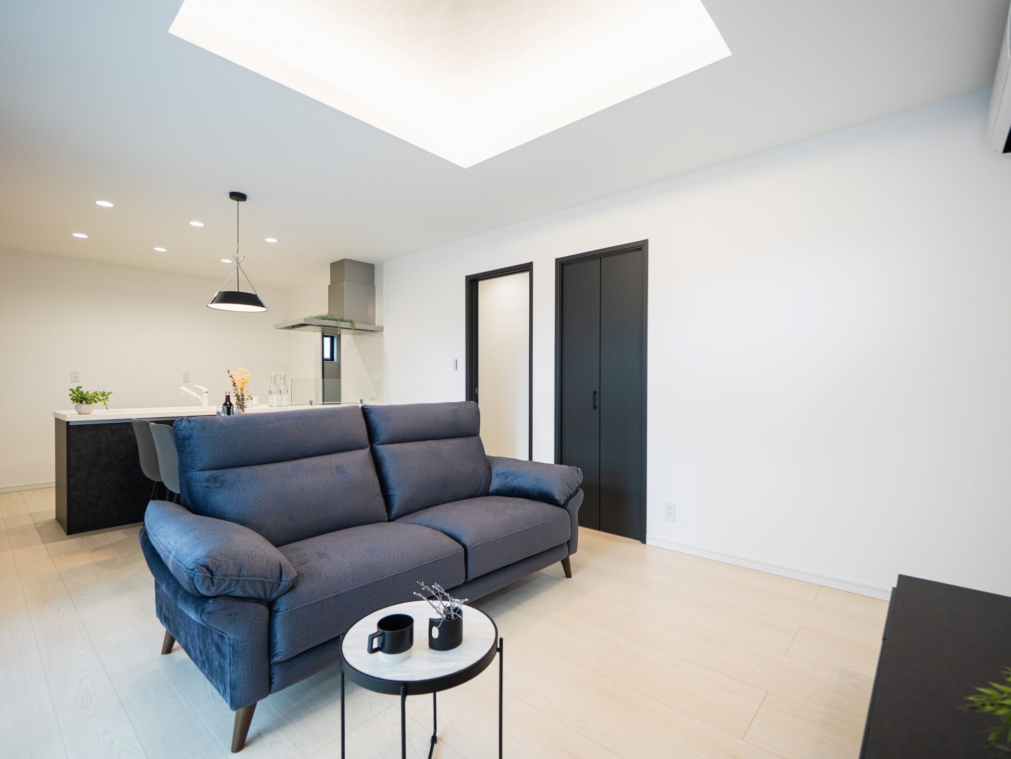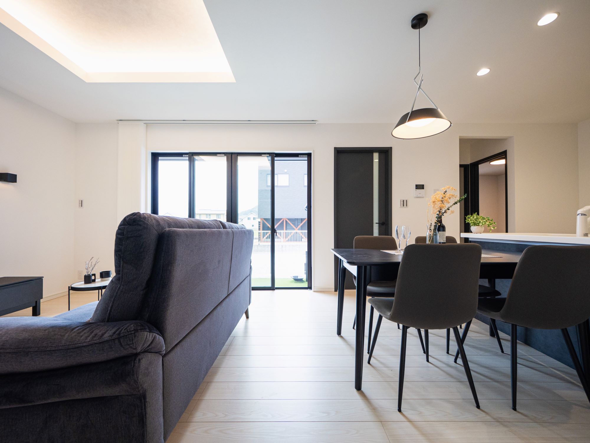 折り上げ天井と大きな窓が生み出す、心地よいLDK。リビング・ダイニング・キッチンがゆるやかにつながり、家族が自然と集まります。