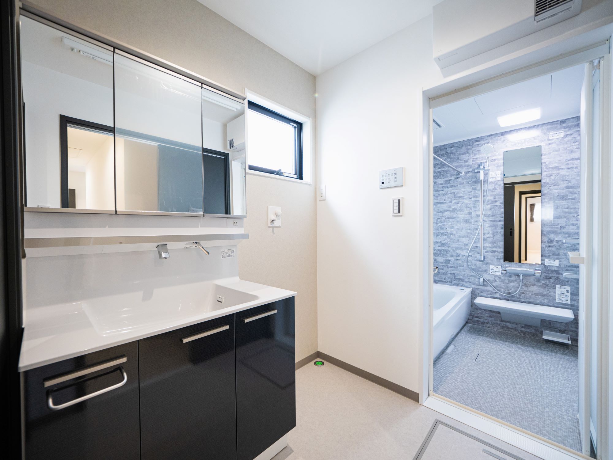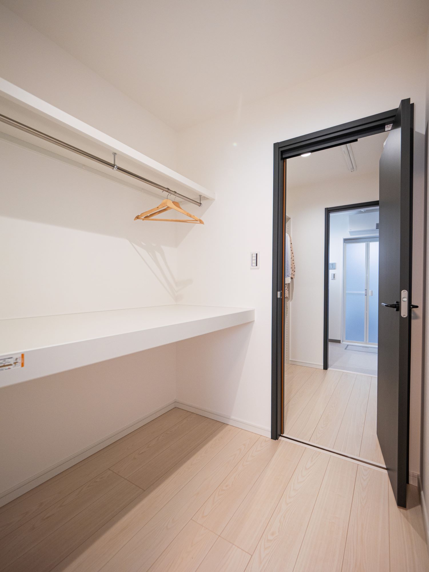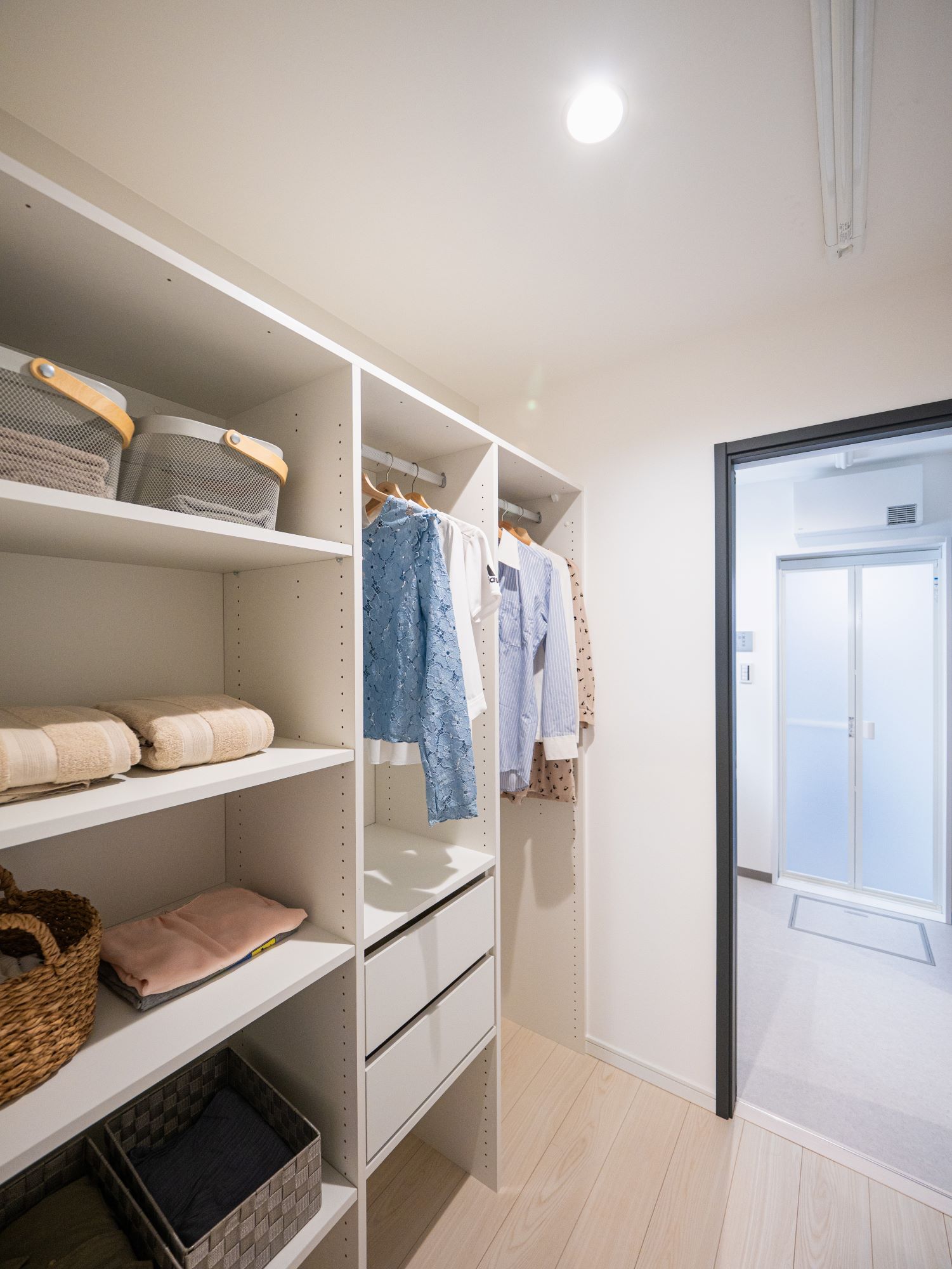 洗面スペースのすぐ隣にファミリークローゼットを配置。タオルや着替えの出し入れがスムーズで、片付けやすく整った暮らしが叶います。