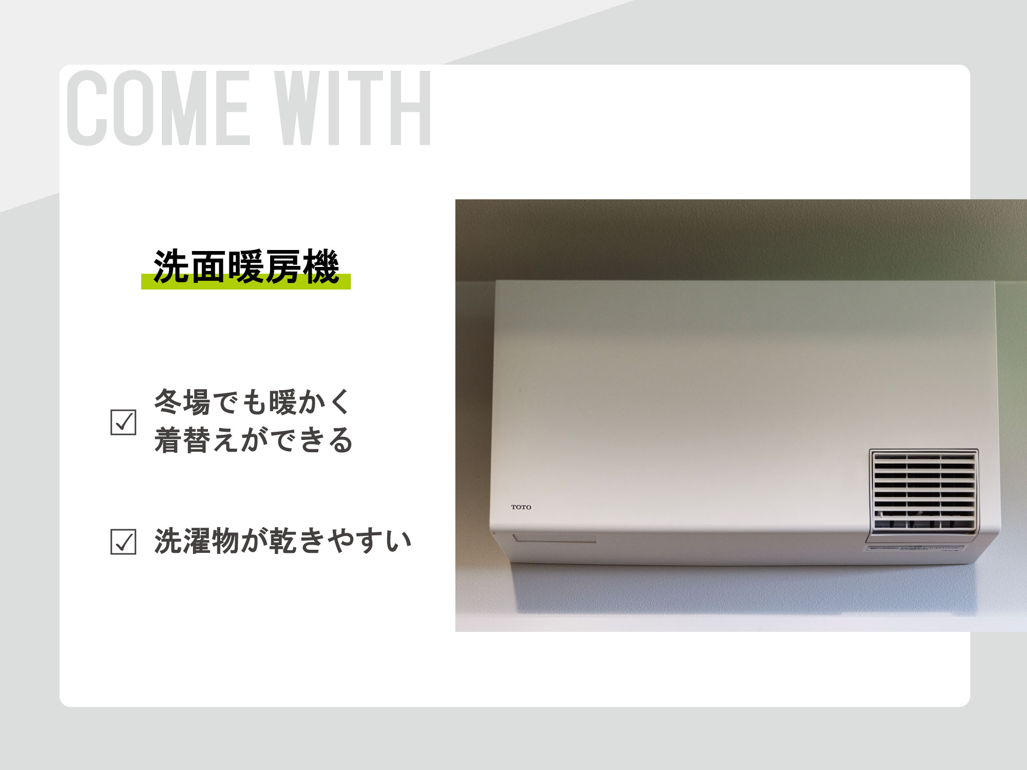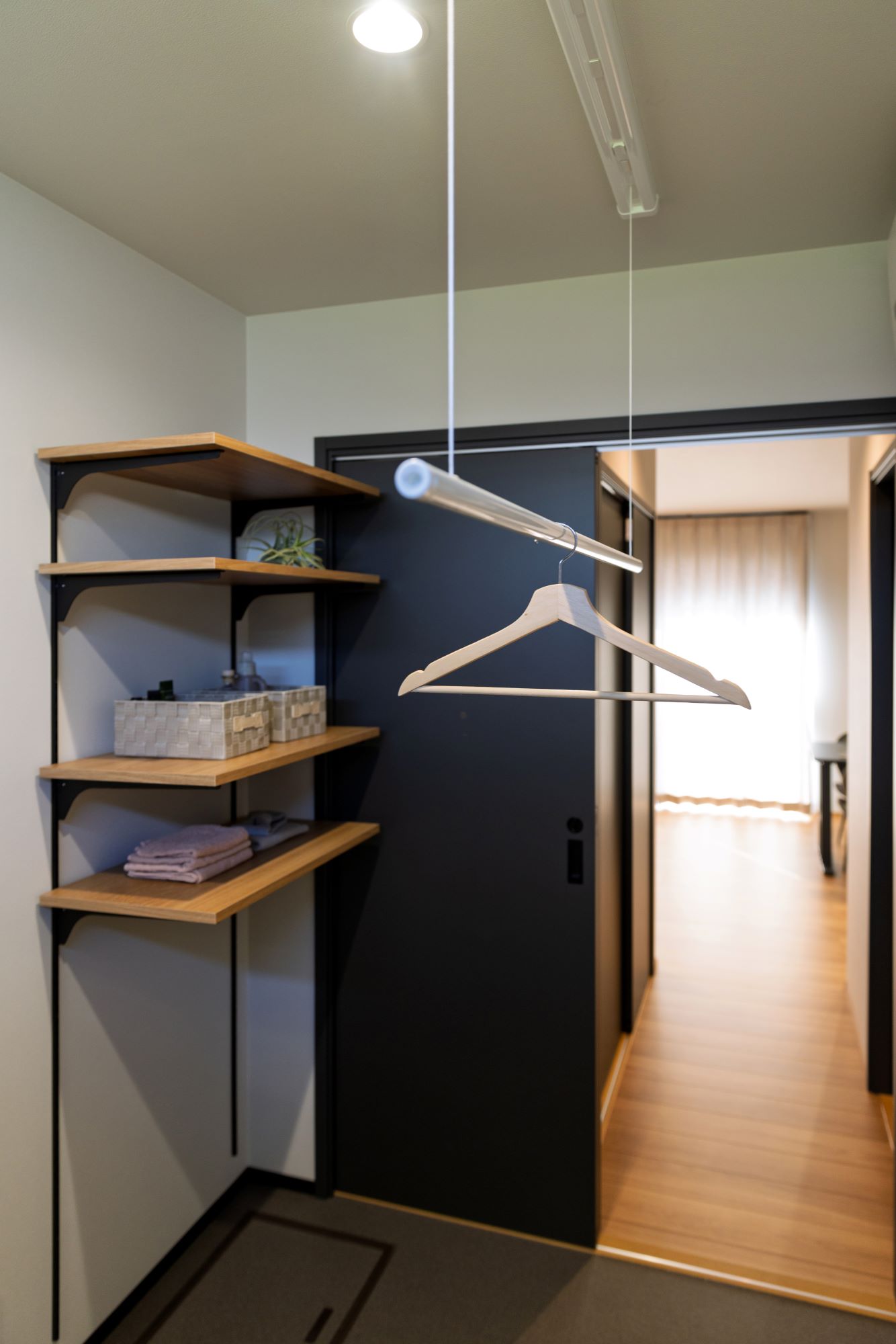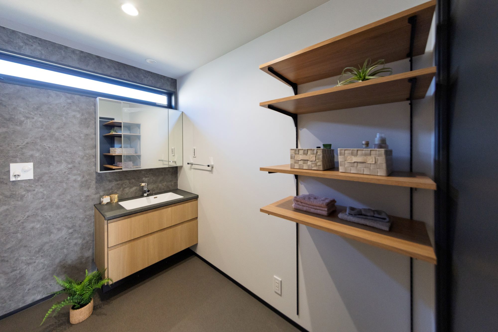 洗面脱衣室には、家事負担を軽減する設備付き。収納棚でタオルや日用品をすっきり整理し、室内物干しで雨の日もラクに洗濯が完結!