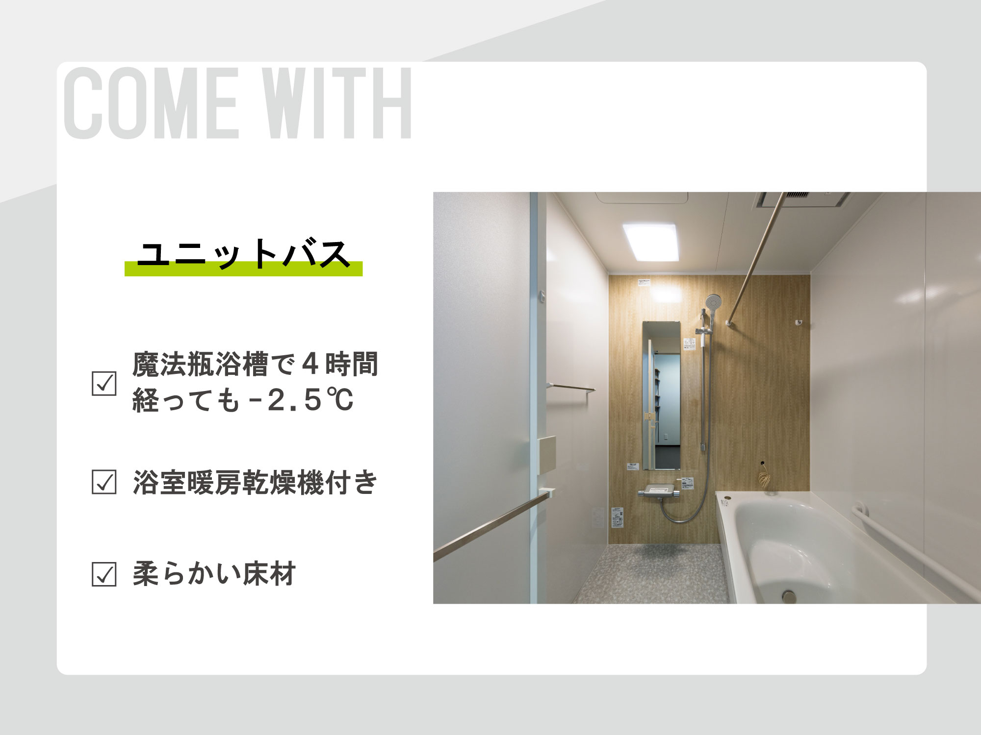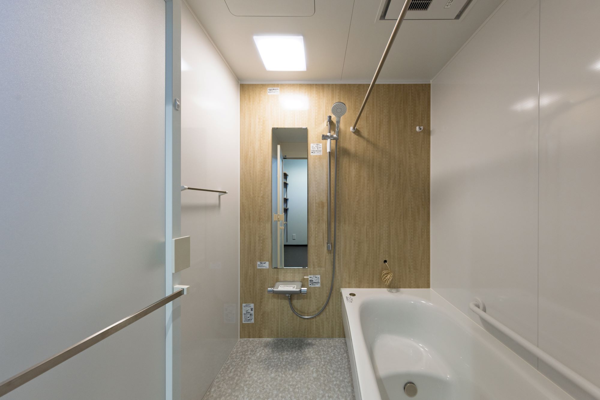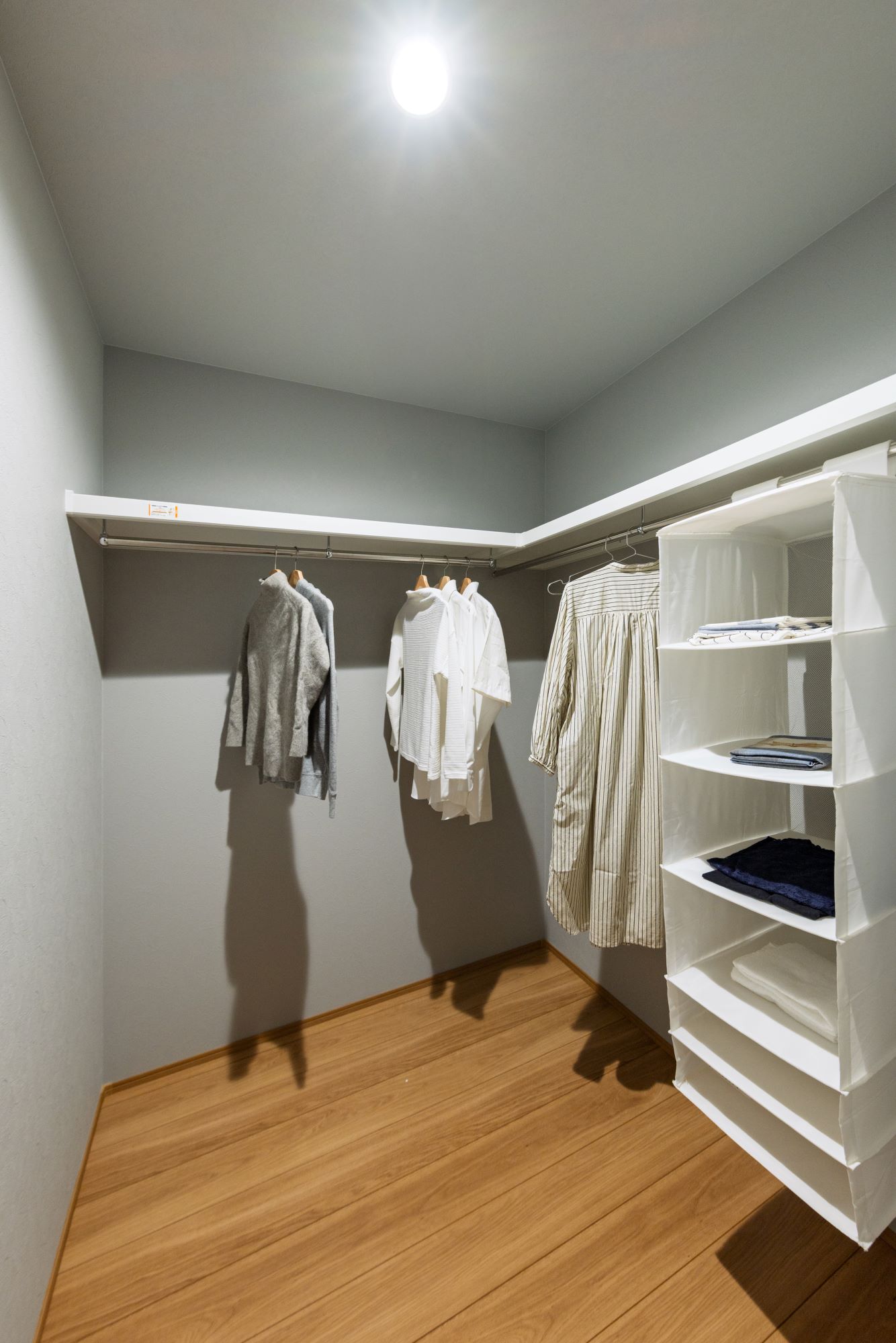 洗面脱衣室には、家事負担を軽減する設備付き。収納棚でタオルや日用品をすっきり整理し、室内物干しで雨の日もラクに洗濯が完結!