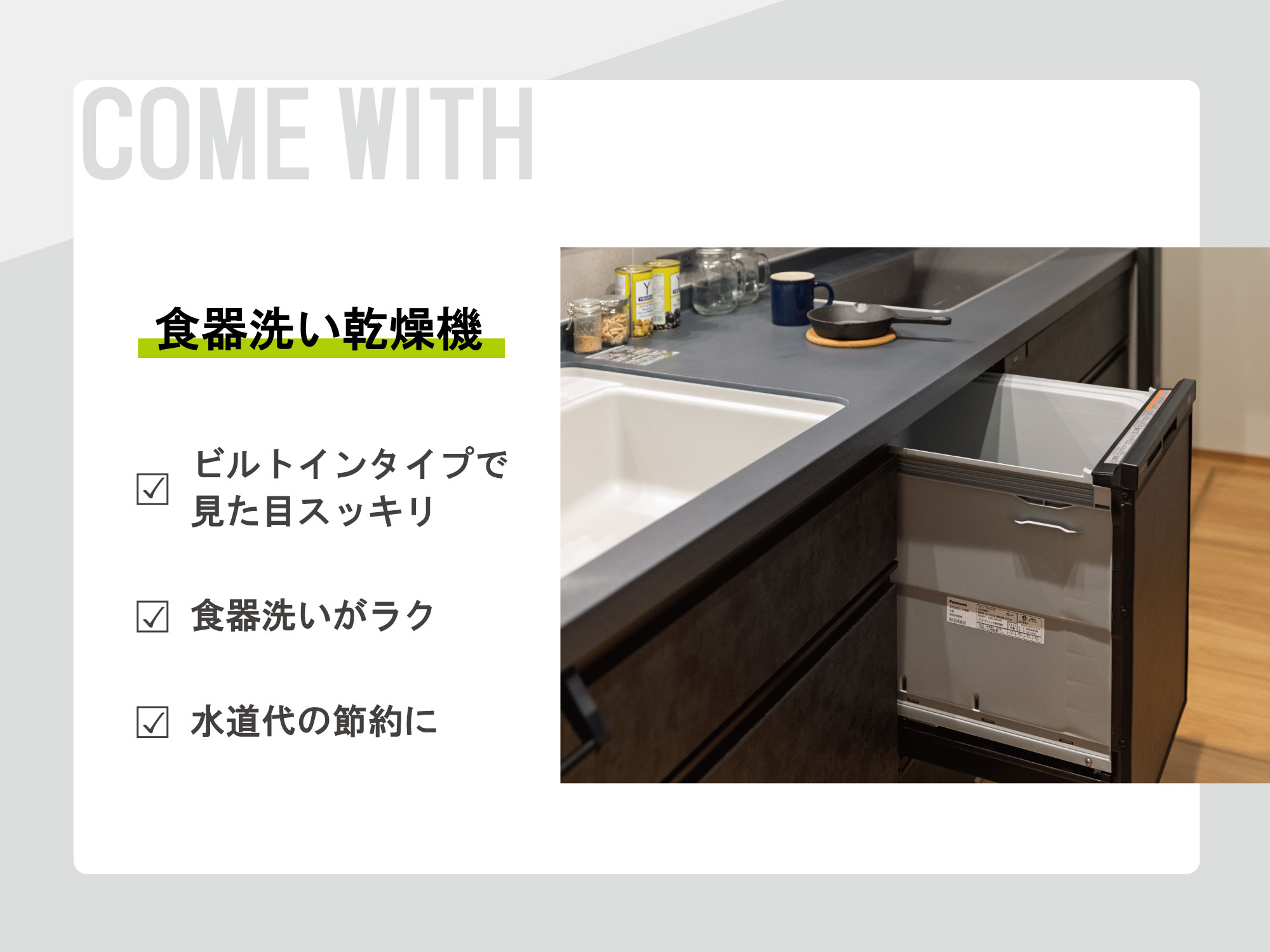 落ち着いた色合いの対面キッチンは、料理をしながらリビングに視線が届く安心のつくり。家族との会話も自然と生まれる、心地よい配置です。