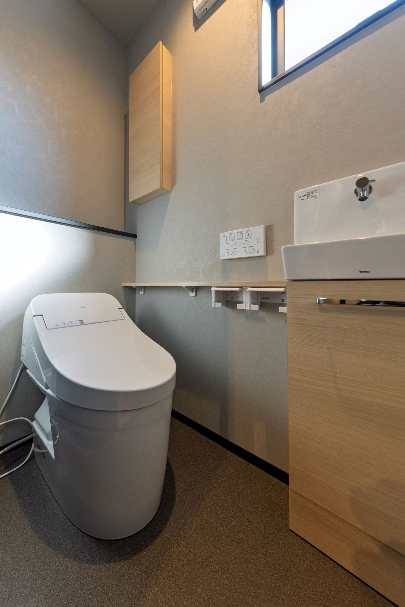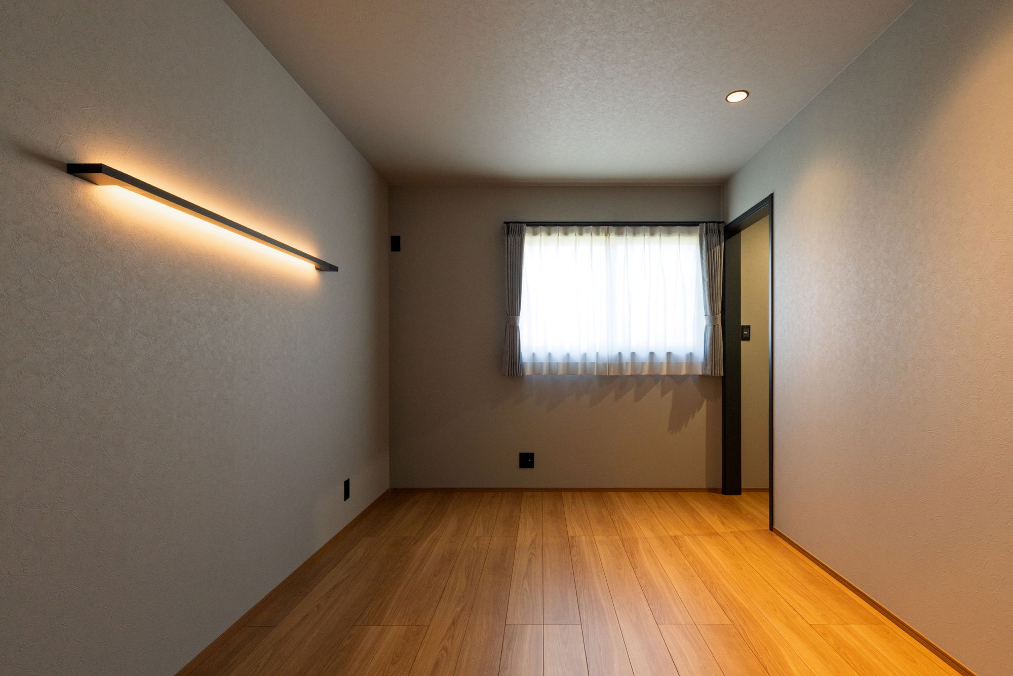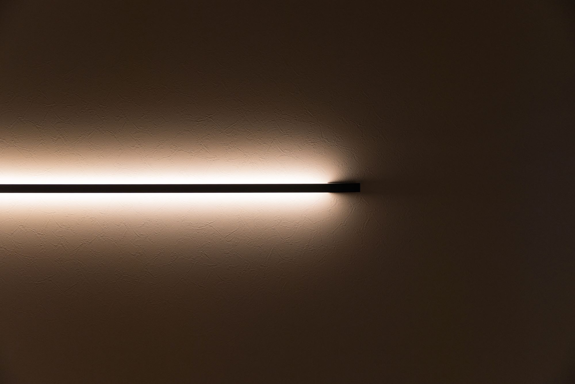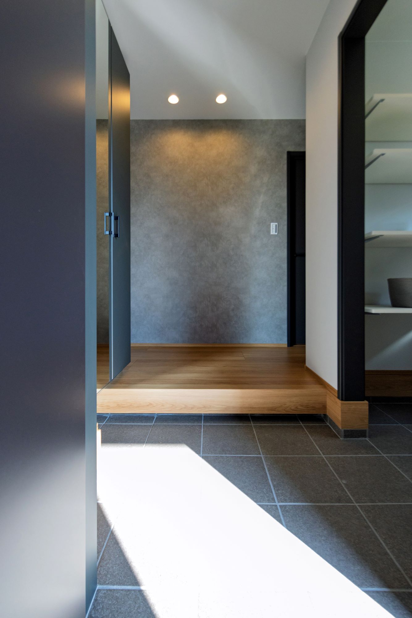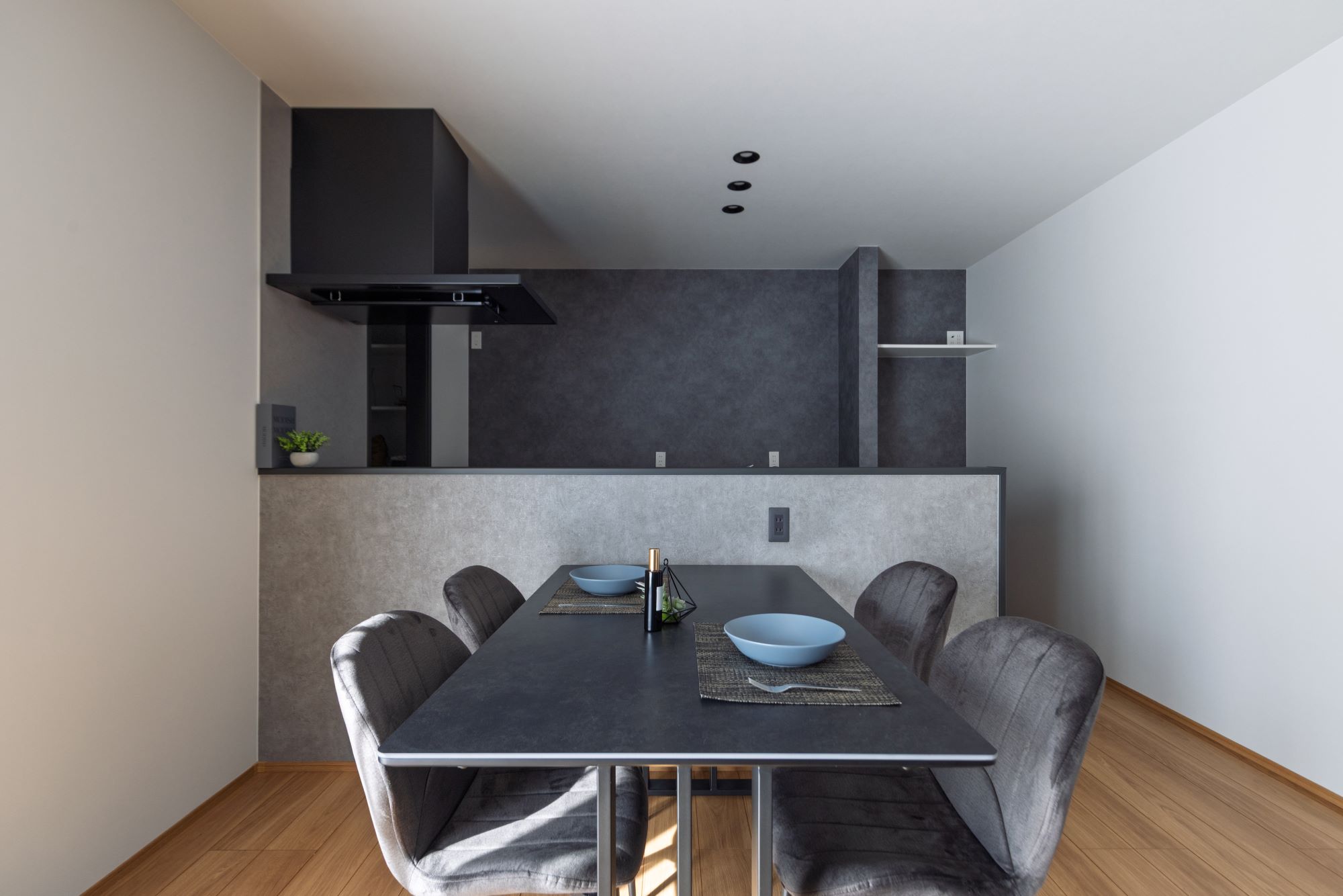 グレーの質感が際立つ上質な空間。照明を灯せば温かみが広がり、消せば陰影が映えるシックな表情に。