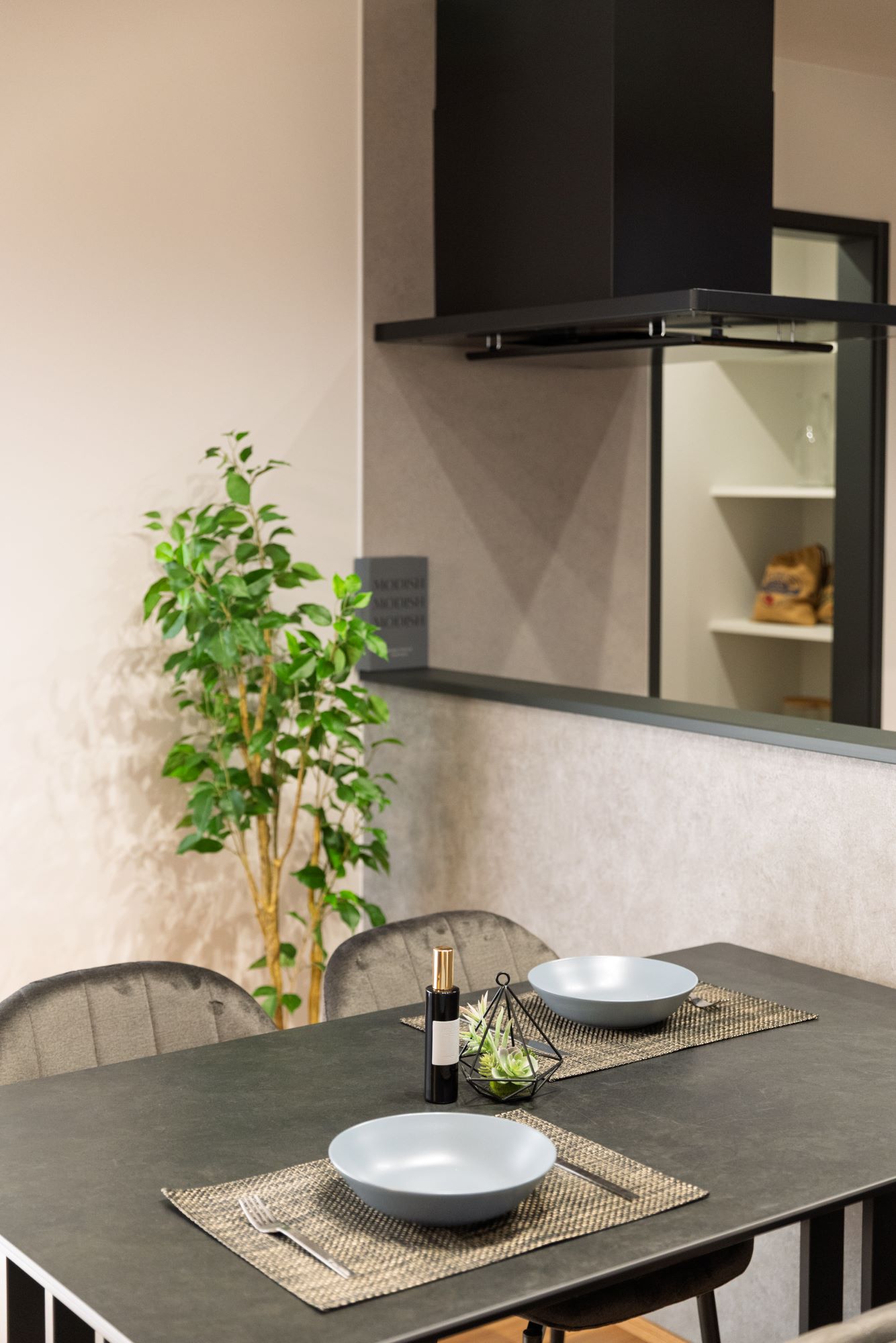 木太南小学校区にモデルハウスが誕生!グレー・ブラックなどの深みあるトーンでまとめ、質感と光のコントラストが美しい平屋。土間収納やパントリーなど、使う場所に合わせた収納設計で、洗練された暮らしを実現します。デザインと機能性のどちらも妥協しない、心地よい空間が広がります。★現在外構工事中です。工事完了時期は12月を予定しています。