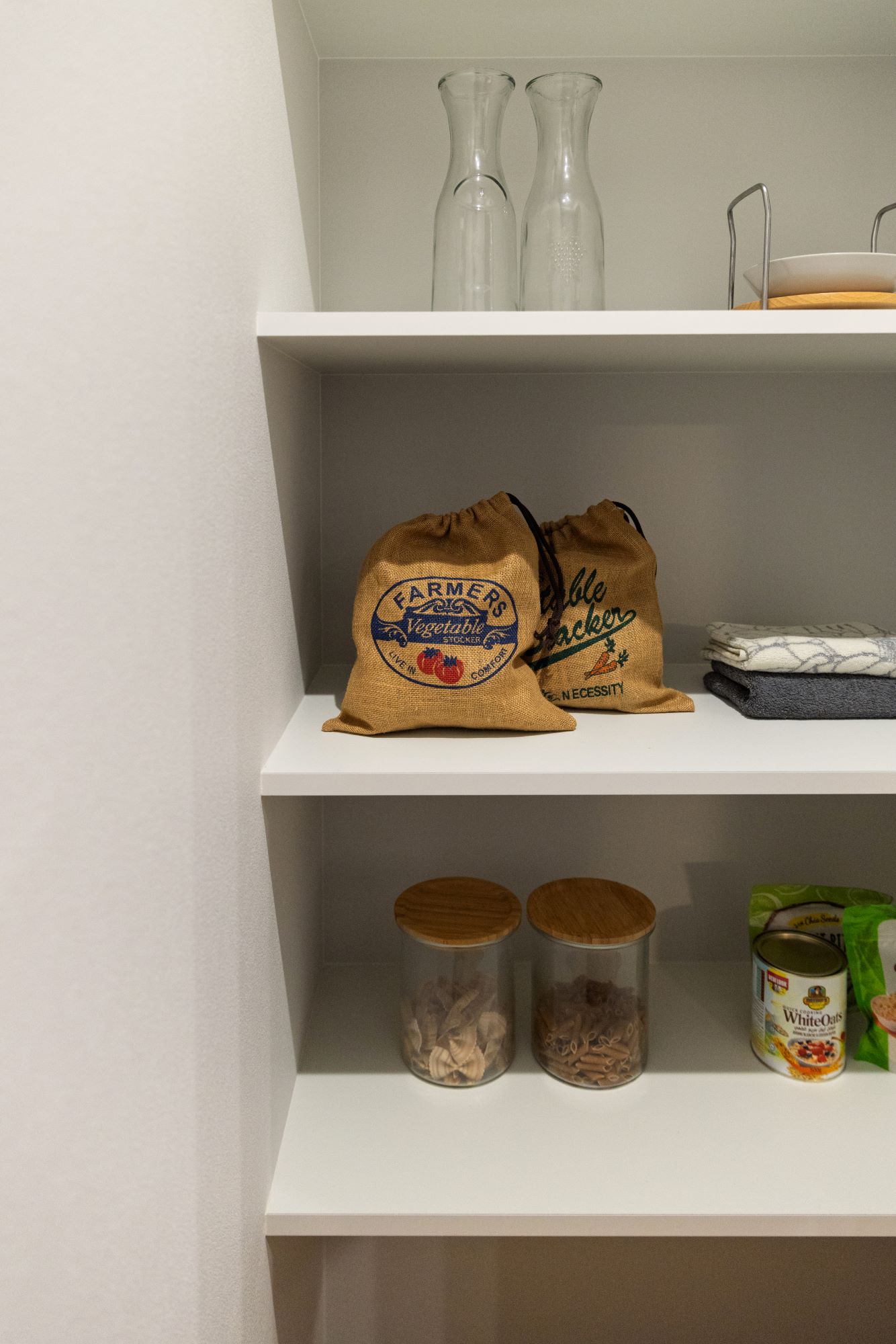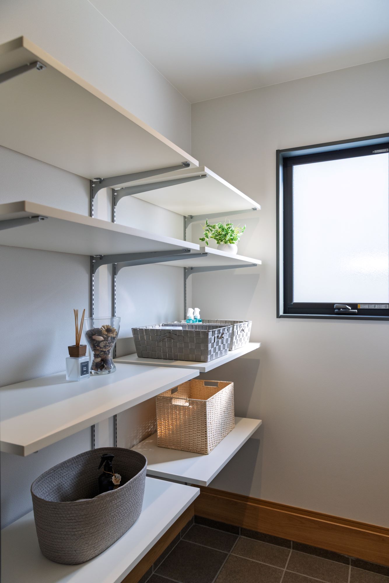 自然光が差し込む明るい土間収納。可動棚で高さを調整でき、靴や日用品をすっきり整頓。ベビーカーやスポーツ用品の置き場所にも。