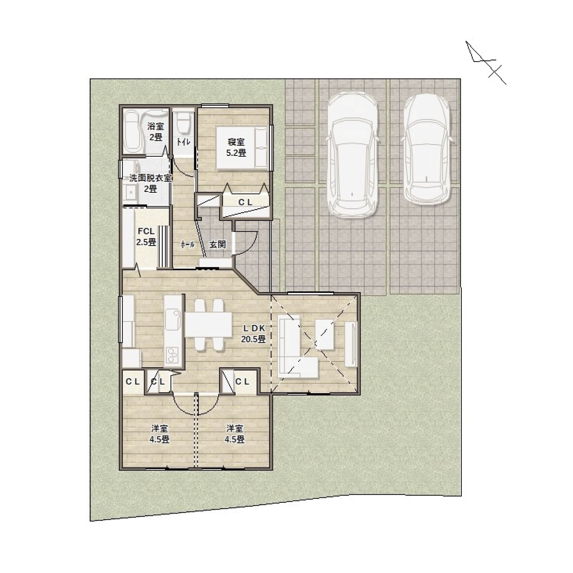 【耐震等級3】水回り一直線×勾配天井リビングの平屋